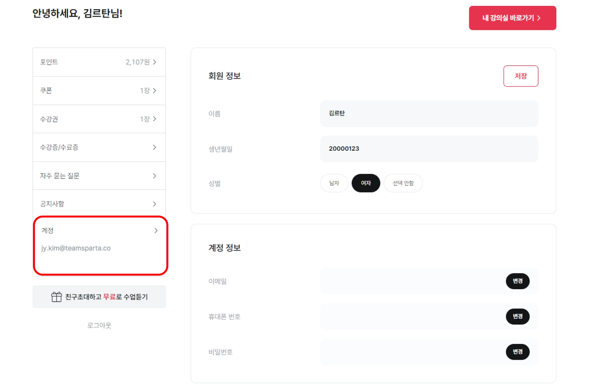 마이페이지 수강권 클릭!